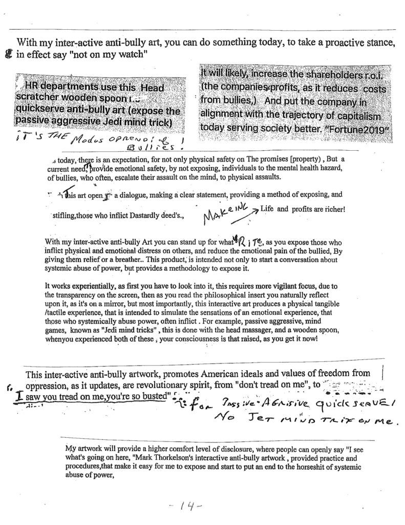 If my liberties and constitutional rights can be jeopardized, for the benefit of another’s business. For example, the Sullenberger inspired poem and quick serve interactive art, intended to expose passive aggressive bullies. And inspire people to conduct themselves with decorum and civility, were characterized as threatening, it was laughed out of court and dismissed.
